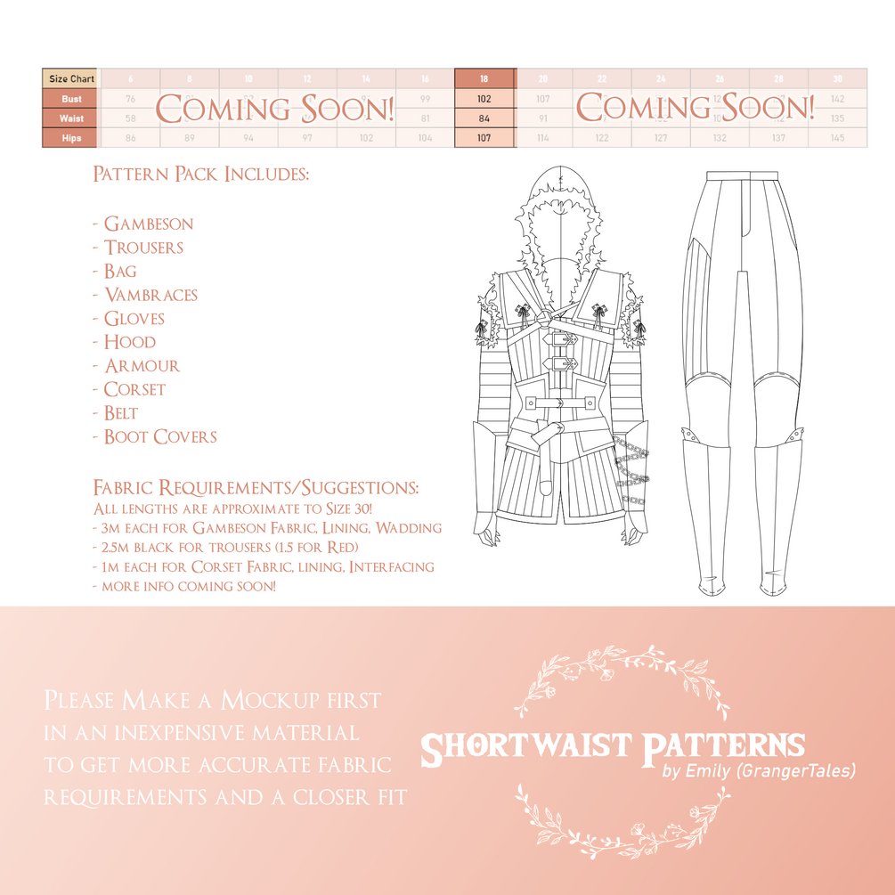 All Fabric, Material, and Notions requirements will be listed in the upcoming instructions packet, but it is preferred to lay out your pattern pieces, make your mockups, and THEN calculate how much fabric you personally need. Please do not purchase any fabric before you have done this - I am not liable for any purchases you make beyond my pattern.